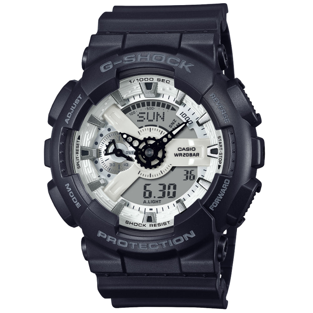 Go bold and confident with a strikingly straightforward G-SHOCK in high-contrast black and white. Beginning with a base of G-SHOCK jet black and then bring in a bright dial finished in white vapor deposition. The monochromatic statement is a study in contrasts—matte black against glossy white. This abundantly cool design is available in five different models. Choose your favorite — the GA700 with front button design, the GA100 or GA110 with large case, the triple-graph design of the DW6900, or the GA2100 with octagonal case.