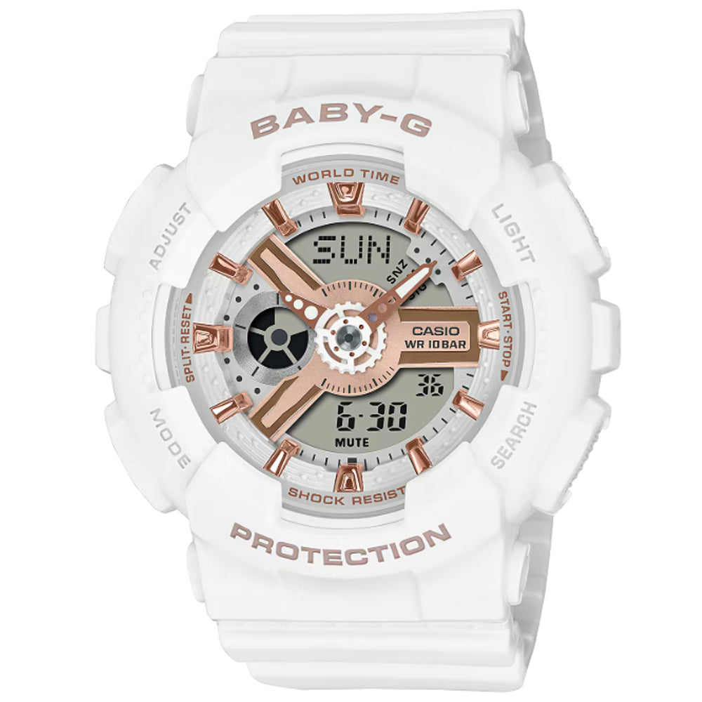 Slip on a splash of clean, fresh color with an eye-catcher inspired by the popular design of the G-SHOCK GA-110. The intricate combination of dial, index markings, and other components evokes mechanical gears with a pop of sharpness that adds a burst of energy. A standout in street fashion, this BABY-G delivers function, as well. Enjoy handy, reliable functions like LED lighting and stopwatch, as well as the shock and water resistance you count on.