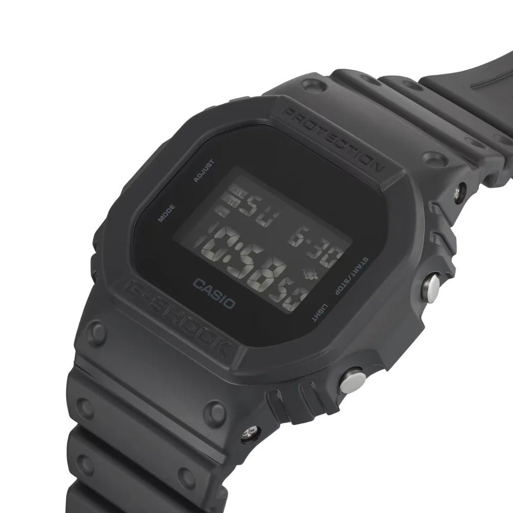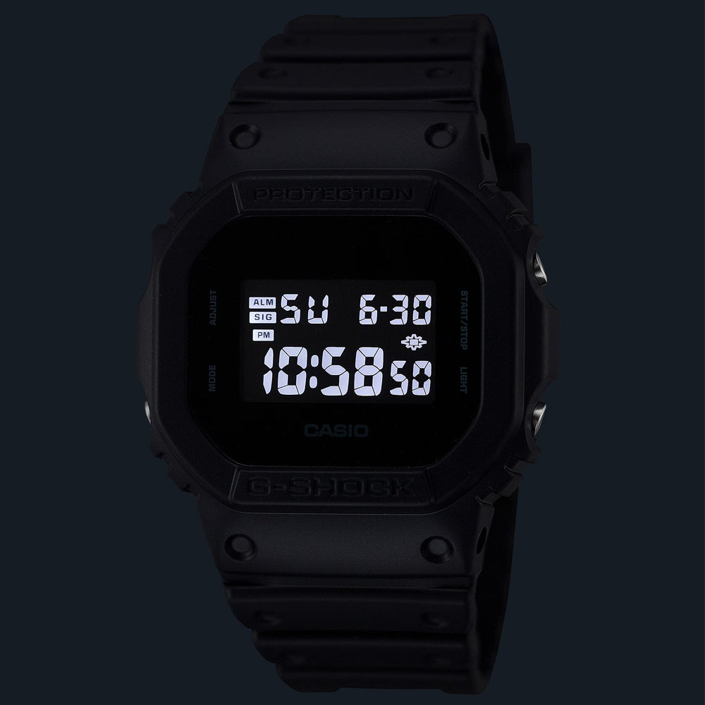 This is a black-and-white themed "Solid Colors" G-Shock model in black. This watch is entirely black, and its plain texture is emphasized by the single-tone color. The matte color on the body and band of the watch not only allows for a simple color scheme, but also emphasizes the shape of the watch itself. With its distinctive solid design, this model can be worn as a fashion statement.