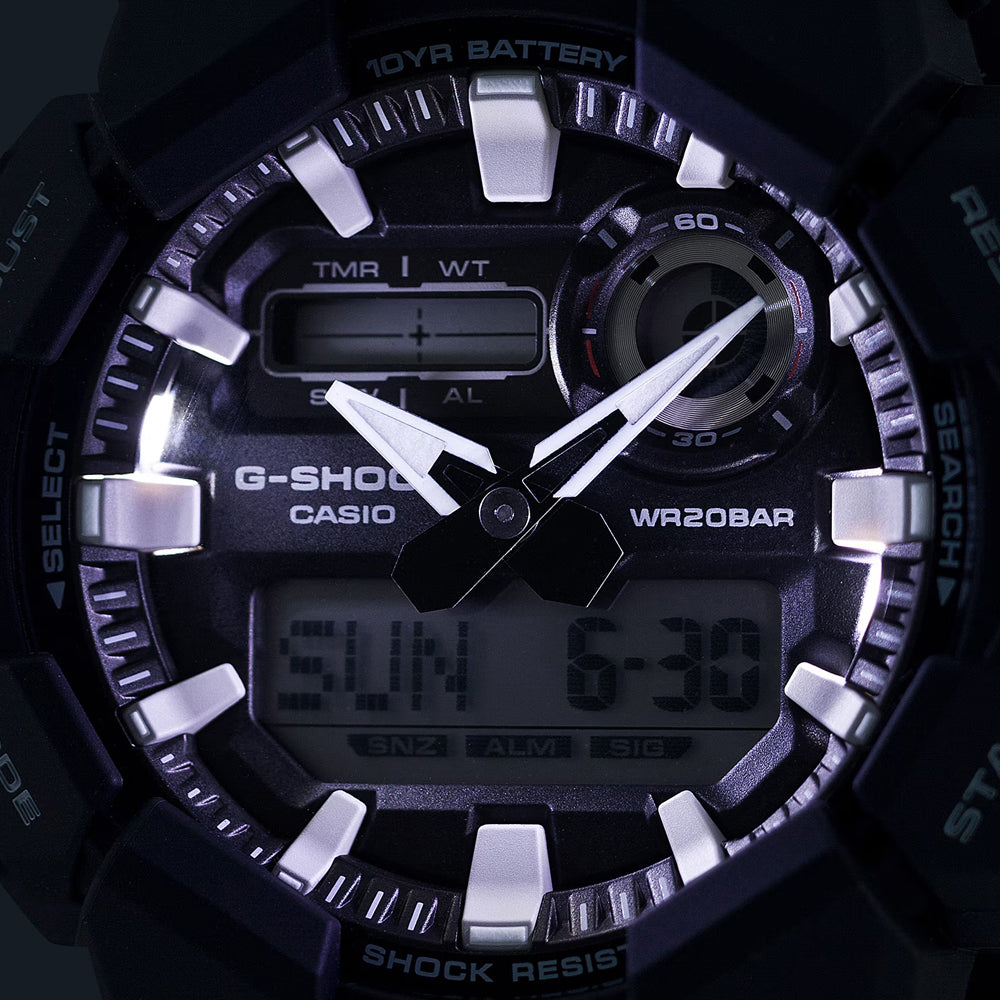 The analog-digital GA-010 delivers handy features like world time and stopwatch, as well as a high-brightness LED light, which can be easily accessed from the large button on front of the case, ensuring visibility even in the dark.