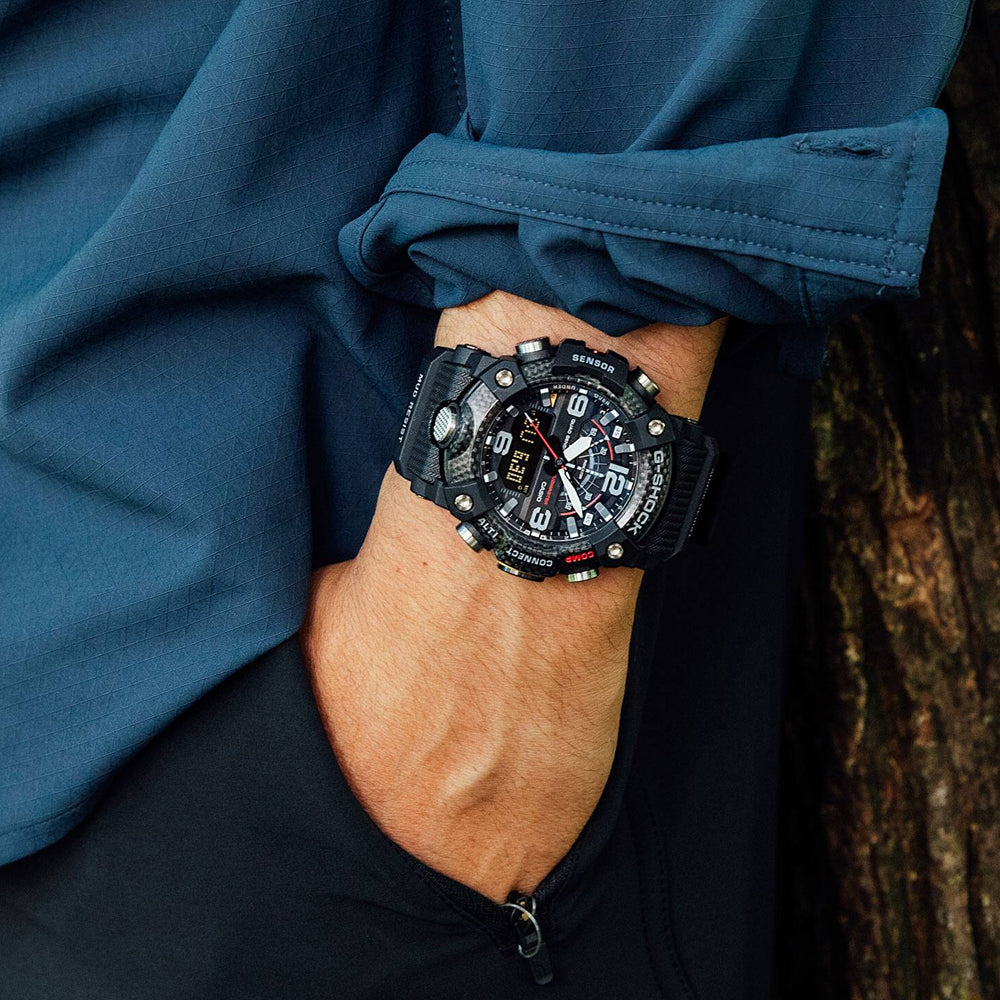 This is a model from the G-Shock Mudmaster Series, designed for use in extreme environments scattered with rubble, dirt and debris, and uses carbon materials. The use of high rigidity carbon on the case keeps damage and deformation at bay, and ensures a high level of airtightness and shock resistance. This model also features a filter that protects against the invasion of mud, a stainless steel panel back, and a back cover made of shock-resistant fine resin embedded with glass fibers, giving it a high level of resistance to dust and mud. The bezel also uses three layers of fine resin with carbon fiber inserts and is designed to resemble a portable gasoline can that could be found on off-road vehicles. Function-wise, this model comes with compass, altimeter/barometer, temperature reader and pedometer. In addition to being able to easily correct the time using the dedicated CASIO WATCHES app, there are lots of other useful features including the Mission Log feature, which automatically records in the app altitude data obtained from the watch and route data obtained by your smartphone. This is a toughness watch that supports you in taking quick decisions and accurate actions.