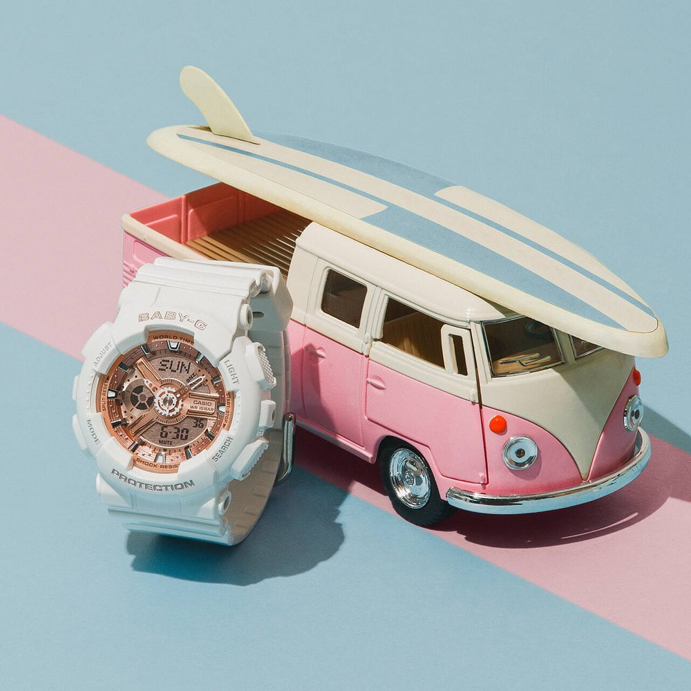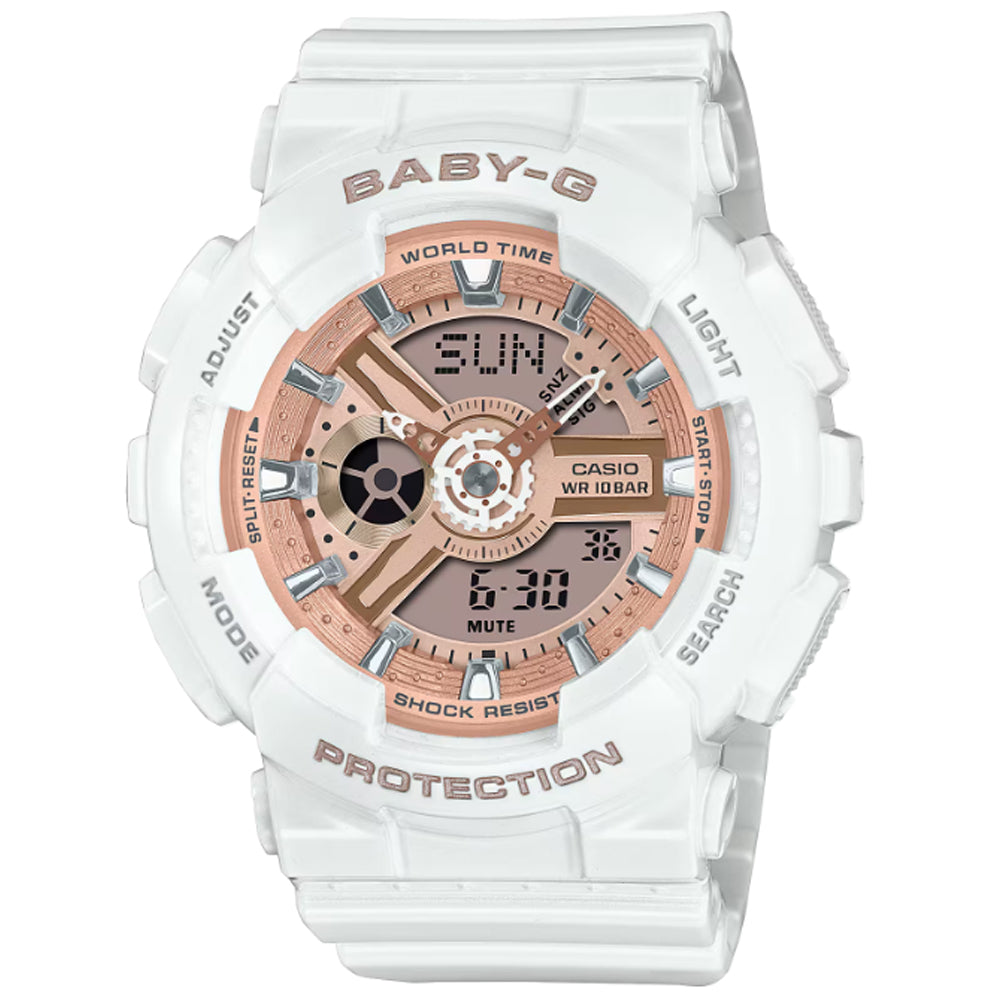 Slip on a splash of clean, fresh color with an eye-catcher inspired by the popular design of the G-SHOCK GA-110. The intricate combination of dial, index markings, and other components evokes mechanical gears with a pop of sharpness that adds a burst of energy. A standout in street fashion, this BABY-G delivers function, as well. Enjoy handy, reliable functions like LED lighting and stopwatch, as well as the shock and water resistance you count on.
