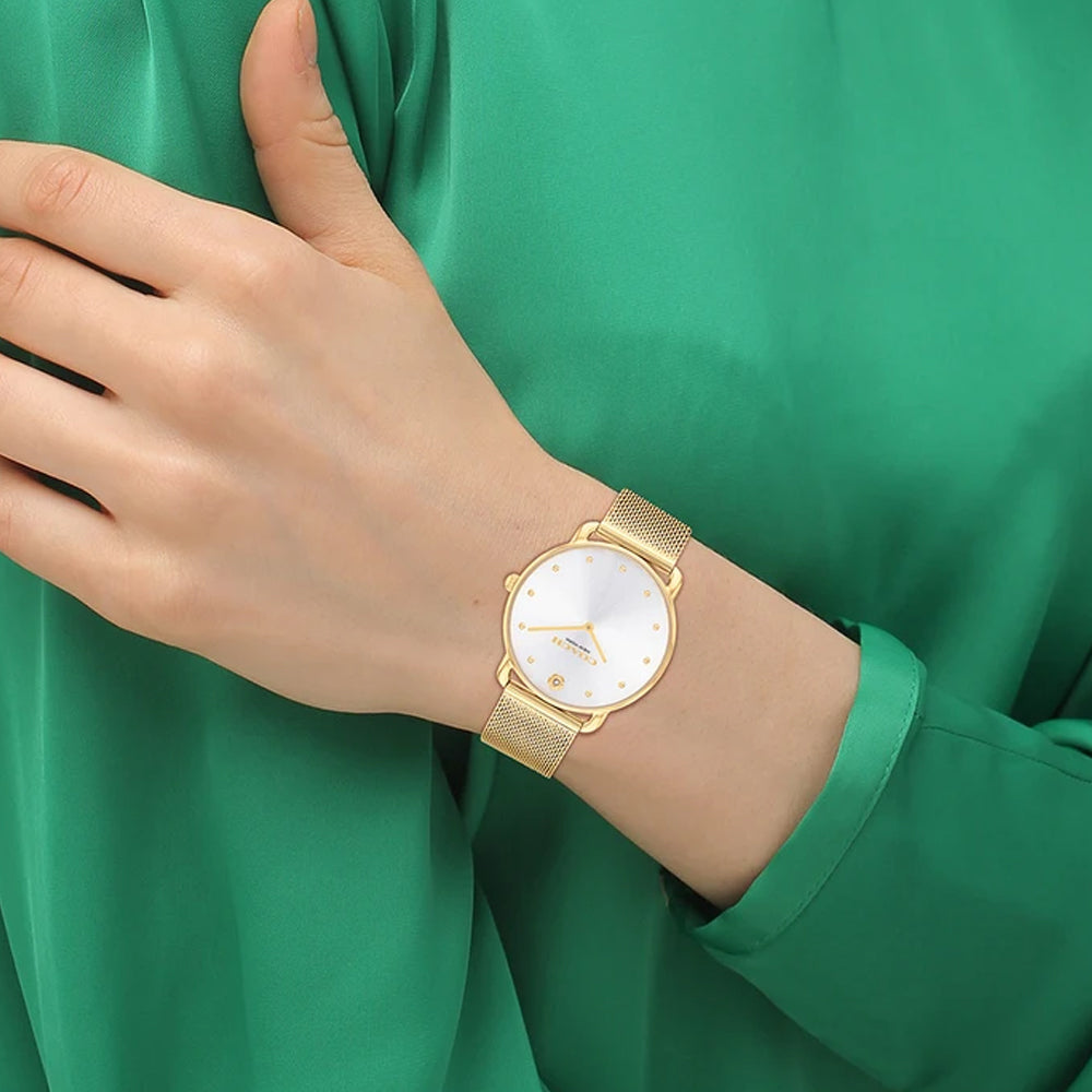 With clean lines and a modern minimalist sensibility, the Elliot is a true design classic ready for workdays and weekends. Finished with a sleek mesh bracelet, this gold tone round watch features a white sunray dial detailed with dome markers and the Coach Tea Rose motif at 12 o’clock